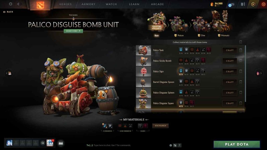 | Techies | Palico Disguise Bomb Unit Poison Palico Disguise Bomb Unit Dire Palico Disguise Bomb Unit Prismatic Palico Disguise Bomb Unit |